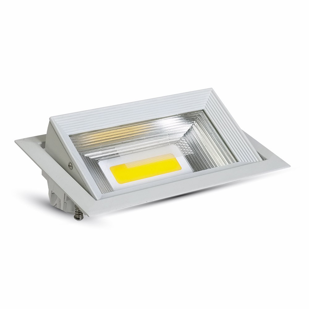 Interiérová LED podhledová svítidla osazená COB čipem o výkonu 30W. Hliníková šasi lakovaná bílou barvou, leštěný výklopný reflektor. Montáž do SDK podhledu. Životnost světelného zdroje L70 je 25.000 hodin. Záruka 2 roky.